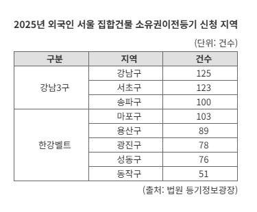 특히 외국인 10명 가운데 4명은 강남3구(강남·서초·송파)와 한강벨트(용산·마포·성동·광진·동작구)에 집을 마련했다.