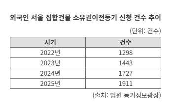 4일 법원 등기정보광장에 따르면 지난해 1년 동안 외국인들의 서울 집합건물 소유권이전등기 신청 건수는 1911건으로 전년 1727건 대비 10.7% 급증했다. 2022년 1298건, 2023년 1443건 등 4년 연속 상승세다.