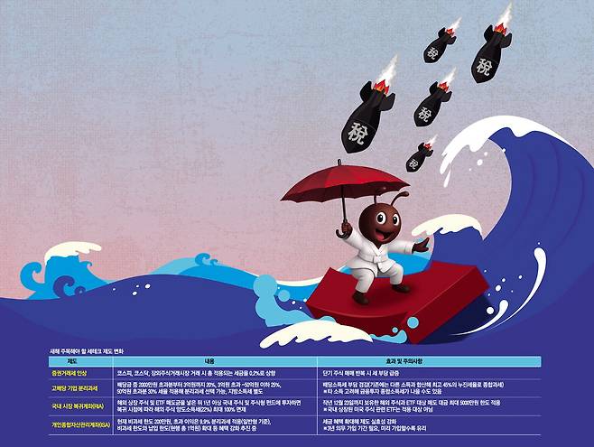 #'국장 단타, 미장 장투' 철학을 가지고 있는 개미투자자 A씨는 새해 들어 투자스타일을 크게 바꿀까 생각 중이다. 배당은 많아도 금융소득종합과세에 신경이 쓰여서 무겁게 안 움직이는 배당주보다는 빨리 움직이는 테마주를 선호했는데 이제 거래세는 늘어나고 배당소득 분리과세가 도입되면서 상황이 달라졌다. 단타의 세후 수익률은 낮아졌고 금융소득종합과세 없이 배당투자를 할 수 있게 됐다. 특히 장기투자로 매매차익이 누적된 해외 주식을 팔아 국내 주식을 사면 양도소득세도 면제된다고 하니 미장에서 하던 장투를 국장에서 배당주로 하는 게 나쁘지 않을 수도 있다는 생각이 든다.