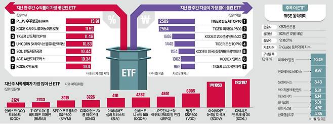 신규 자금 유입 1위는 ‘TIGER 반도체TOP10’이 차지했다. 한 주간 2589억원이 순유입됐다. ‘TIGER 조선TOP10’(4위·1448억원), ‘TIGER 코리아원자력’(7위·969억원) 등 반도체 외 국내 주요 업종에 투자하는 ETF로도 자금이 몰렸다. 자금 순유입 2위는 ‘TIGER 미국S&P500’(2554억원)이었다. 국내 지수 하락에 베팅하는 자금도 적지 않았다. 1606억원이 순유입된 ‘KODEX 200선물인버스2X’가 세 번째로 많은 자금을 모았고, ‘KODEX 인버스’에도 1002억원이 몰려 6위에 올랐다.