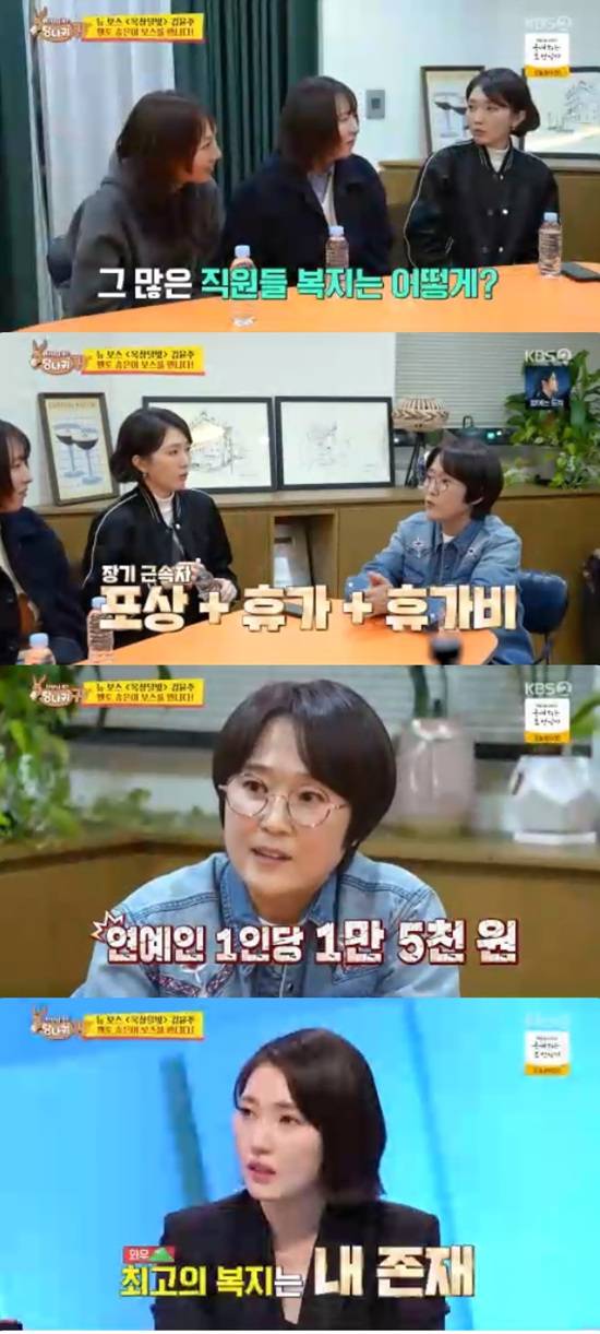 송은이는 장들레가 직원 복지도 물어보자 휴가 때 보너스 외화를 지급하고 장기근속자를 위한 각종 혜택도 있다고 했다.