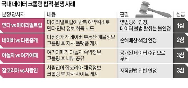 지난해 8월 한인숙박 예약 플랫폼 민다와 마이리얼트립 간 소송 1심에서도 재판부는 민다가 보유한 데이터 자체는 공개돼 있어 마이리얼트립이 크롤링한 것은 불법 탈취로 보기 어렵다고 판단했다. 다만 “마이리얼트립이 크롤링을 위해 민다에서 숙소를 반복해 예약하고 취소한 행위는 영업 방해”라며 1억5000만원을 배상하라고 판결했다.