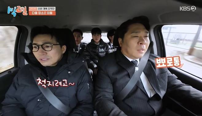 멤버들은 이동 중 피하고 싶은 여행으로 무인도를 꼽았다. 딘딘은 "지금 찍으면 춥고 열악하다"라고 했고, 멤버들도 공감했다. 멤버들은 원하는 콘셉트를 고민하며 당일 퇴근을 제일 많이 언급했다. 차가 좁은 와중에도 김종민은 잠이 들었고, 문세윤은 "대단하다. 적응력이 바퀴벌레보다 더 좋다"고 감탄했다. 이어 유선호까지 잠들었고, 가운데 앉은 이준만 잠들지 못했다.