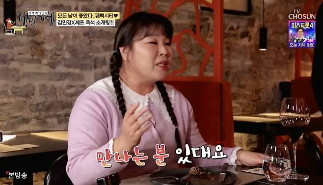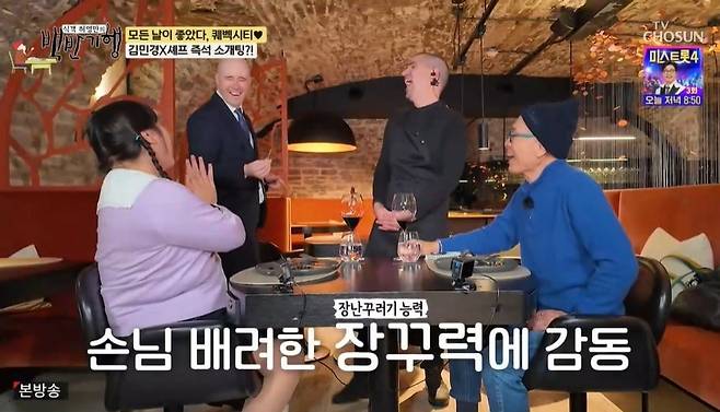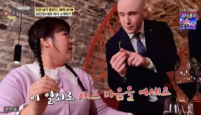 이어 허영만은 셰프에게 김민경을 가리키며 어떤지 물었다. 결혼은 안 했지만, 만나는 사람이 있단 말에 김민경은 "만나는 분 있대요"라고 말했고, 그때 사장이 재빠르게 다가와 열쇠를 건네며 "이 열쇠로 셰프 마음을 여세요"라고 말해 현장은 웃음바다가 됐다.