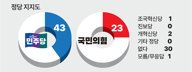 [경기도지사 여론조사] 정당 지지도… 민주 43%vs국힘 23%