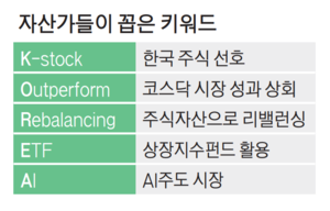 이번 키워드는 한국 주식(K-stock) 선호, 한국 및 코스닥 시장의 성과 상회(Outperform), 주식 자산으로 리밸런싱(Rebalancing), 상장지수펀드(ETF) 활용(ETF), AI 주도 시장(AI)의 앞 글자를 딴 것이다. 국내 증시의 재평가와 성장에 투자하겠다는 의미가 담겨 있다.