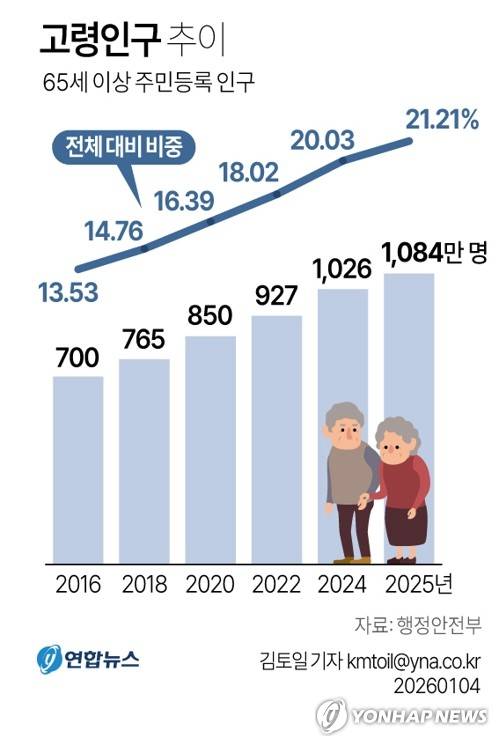 (서울=연합뉴스) 김토일 기자 = 4일 행정안전부의 '2025년 주민등록 인구통계 분석' 결과에 따르면 작년 65세 이상 고령 인구는 1천84만822명으로 전년(1천25만6천782명)보다 58만4천40명(5.69%) 증가했다.