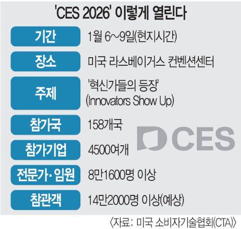 CES 2026에는 전 세계 158개국에서 4500여개 기업이 참가한다. 한국 기업의 참가 규모는 기업 수 기준 782개다. 미국(1314개)과 중국(915개)에 이어 세계 3위다. 전시 부스 기준으로는 총 845개 부스가 운영된다. 참가 기업 수는 전년보다 다소 줄었으나 기술경쟁력은 여전히 이목을 끈다.