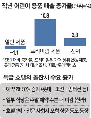 프리미엄 수요 증가는 돌잔치에 그치지 않는 모습이다. 롯데 유통사 이용 고객 약 1700만명의 거래 데이터를 분석한 롯데멤버스 보고서에 따르면 지난해 1~9월 유아·어린이 용품 중 프리미엄 상품(가격 기준 상위 25%) 매출 비중은 2024년 58.9%에서 지난해 63%로 높아졌다. 또 작년 일반 용품 매출은 1.1% 줄었지만, 프리미엄 상품 매출은 10.8% 늘었다.