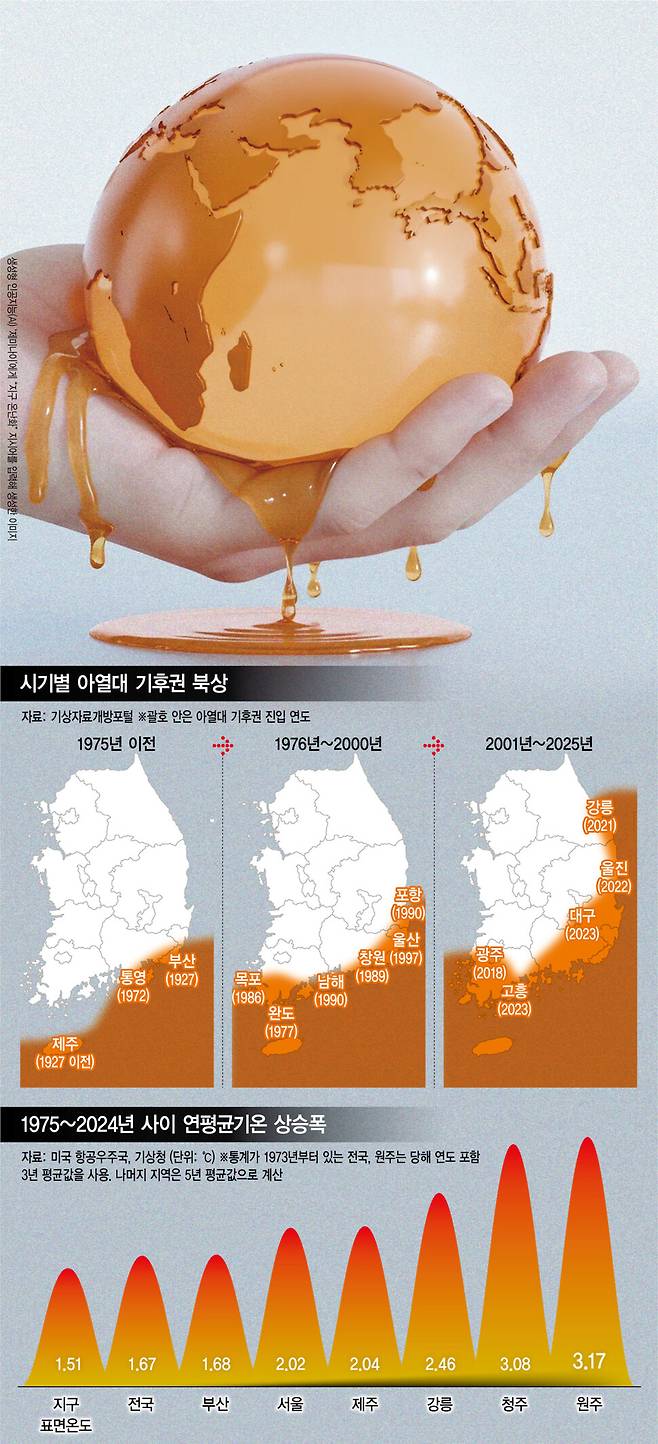 1975년부터 2024년 사이 기후변화의 영향에 따른 연평균기온 상승폭을 보면, 우리나라 전국 평균기온은 1.67도 올라 지구 표면온도 상승폭(1.51도, 미국 항공우주국)보다 컸다. 우리나라 안에서는 원주(3.17도), 청주(3.08도), 강릉(2.46도)의 상승폭이 전국 평균을 크게 웃돌았다. 부산은 1.68도, 서울은 2.02도 올랐다. 최근 5년간 서울의 11월 평균기온은 8.7도였다. 1975년 이후 서울의 기온 상승 속도를 고려해 산술적으로 계산해보면, 약 32년 후엔 서울도 아열대권에 속할 수 있다.