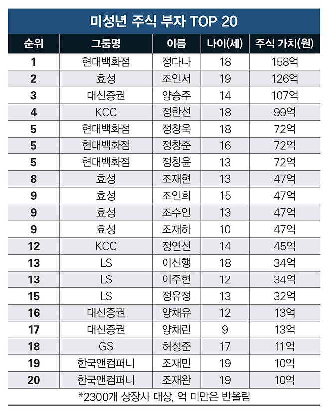 국내 상장사 오너 일가의 19세 이하 미성년자가 보유한 주식 평가액은 1135억원(2025년 12월15일 기준)에 달하는 것으로 집계됐다. 이 중 미성년자 주식 부자 상위 20명이 보유한 주식 가치는 1093억원으로, 2025년 초(2025년 1월2일 기준) 평가액 대비 300% 이상 올랐다. 시사저널과 기업분석 연구소 리더스인덱스가 2300개 상장사 오너 일가 친인척 가운데 미성년자 주주 60명을 대상으로 보유 주식 평가액을 전수조사한 결과다.