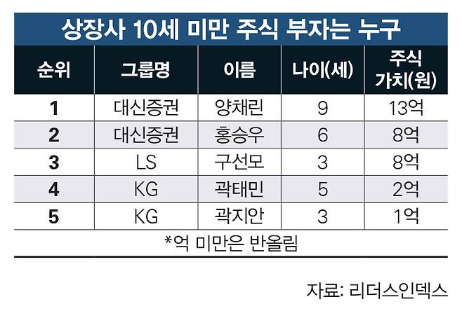 2025년 최연소 주식 부자는 곽재선 KG 회장의 손자이자 곽정현 KG케미칼 대표의 쌍둥이 자녀인 곽태이군(1)과 곽지이양(1)이다. 이들 쌍둥이는 2024년 7월3일 태어났는데, 생후 23일 만에 KG케미칼 주식 1만6000주씩을 장내 매수했다. 2025년 말 기준 이들의 보유 주식 평가액은 각각 9억2480만원이다.