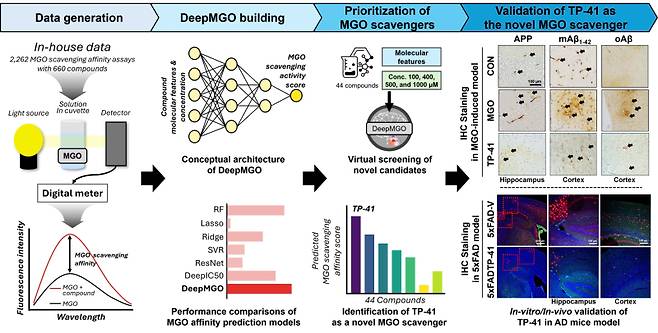 연구팀은 DeepMGO를 활용한 AI 스크리닝을 통해 기존 트립토판 계열 물질보다 혈뇌장벽(BBB) 투과율이 우수한 신규 유도체 'TP-41'을 발굴하는 데 성공했다. TP-41은 MGO를 직접 소거해 독성을 낮추는 동시에, 뇌로의 전달 효율을 높인 차세대 후보 물질로 평가된다.