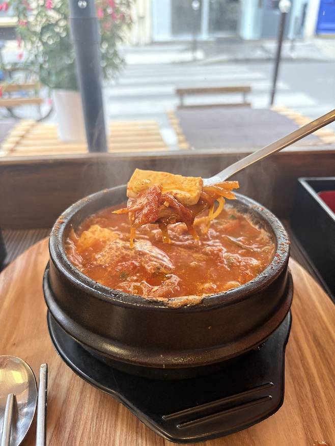 | ▲ 외국인 사업자가 운영하는 파리 한식당의 김치 찌개 파리 북역 근교의 한국에서 오래 거주하며 한국 식당에서 일한 적 있는 외국인 사장님이 운영하는 작은 한국 음식점의 김치찌개. 직원도 한국인이며, 사장님도 한국어를 완벽히 구사한다. 한국에서 먹던 어지간한 김치찌개의 맛보다 얼큰하며 맛있었다. 하지만 국적에 의하여 프로젝트 스티커를 받지 못했다. |