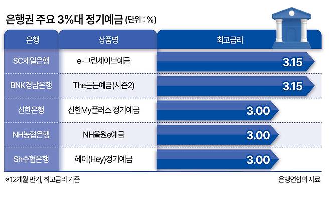 신한은행도 ‘신한My플러스 정기예금’ 가입 때 12개월 만기 기준 3.0%의 최고 금리를 적용하고 있고 NH농협은행과 Sh수협은행의 경우 각각 1년 만기 ‘NH올원e예금’과 ‘헤이(Hey)정기예금’에 조건없이 3.0%의 기본금리를 주고 있다.