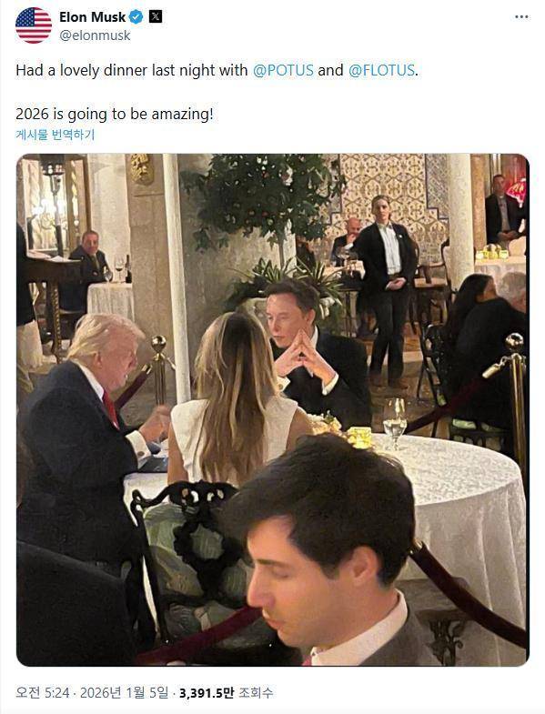 도널드 트럼프 미국 대통령과 한때 맹비난을 주고받았던 일론 머스크 테슬라 최고경영자(CEO)가 트럼프 대통령 부부와의 만찬 사진을 공개하며 관계가 완전히 회복됐음을 시사했습니다. 만찬 시점은 베네수엘라 마두로 대통령 체포 작전이 시행된 이후로 보여집니다.머스크는 현지시간 4일 엑스(X·옛 트위터)에 "트럼프 대통령(@POTUS)과 멜라니아 여사(@FLOTUS)와 훌륭한 저녁 식사를 했다. 2026년은 대단할 것"이라고 쓰면서 저녁 식사 당시 사진을 공개했습니다.