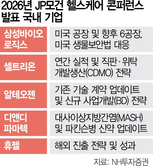 삼성바이오로직스는 2017년부터 10년 연속 공식 초청을 받아 신규 위탁생산(CMO) 브랜드인 ‘엑셀런스(ExellenS)’와 중장기 비전 및 경쟁력을 소개한다. 셀트리온은 서정진 회장의 장남인 서진석 대표가 나서 항체약물접합체(ADC) 신약 개발 현황 등을 공개할 것으로 보인다. 알테오젠의 경우 지난달 새로 선임된 전태연 신임 대표가, 휴젤에서는 지난해 10월 합류한 캐리 스트롬 글로벌 최고경영자(CEO)가 각각 신규 사업개발(BD) 전략과 해외 진출 전략을 발표하며 글로벌 무대에 데뷔한다.