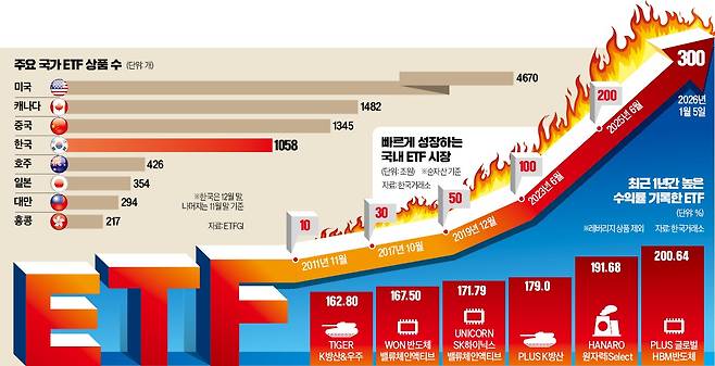 ETF는 주식뿐 아니라 금, 은, 채권 등 다양한 자산에 대한 개인들의 접근성을 끌어올렸다. 금값이 급등한 지난해 개인들은 ‘ACE KRX금현물’ ETF를 1조2011억원어치 순매수했다. 은행 골드뱅킹(금 통장)에 가입하거나 골드바 실물을 매수하던 과거 금 투자 관행과 크게 달라진 것이다. ACE KRX금현물 ETF만 해도 총보수율이 연 0.19%에 불과하다. 골드뱅킹의 10분의 1 수준이다. 이 ETF 순자산이 최근 1년간 3조1317억원 증가한 배경 중 하나다.