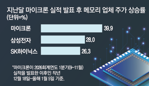 지난달 18일 마이크론이 2026회계연도 1분기 ‘어닝서프라이즈’를 발표하면서 최근까지 주가가 39.9% 오른 점을 감안하면 삼성전자 역시 8일 실적 발표에 이어 D램 가격 상승세가 더해질 경우 추가로 오를 수 있다. 류형근 대신증권 연구원은 “레거시 D램 메모리 매출도 늘어나지만 삼성전자의 올해 HBM 매출액이 23조7000억원으로 전년 대비 183% 성장할 것”이라며 “매출액 기준으로 HBM 시장 점유율은 29%로 마이크론을 제치고 2등을 기록할 것으로 본다”고 말했다.