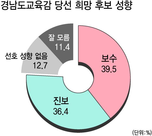 〈부산일보〉가 한국사회여론연구소(KSOI)에 의뢰해 경남도민에게 ‘이번 교육감 선거에서 어느 성향의 후보를 선호하냐’고 물은 결과, 진보 성향의 후보를 선호한다는 응답은 36.4%, 보수 성향 후보를 선호한다는 응답은 39.5%로 집계됐다. 두 응답 간 격차는 3.1%포인트(P)로 오차범위(95% 신뢰수준에 ±3.1%P) 내 접전이다. 다만 선호 성향이 없다는 응답이 12.7%, 잘 모르겠다는 비율이 11.4%로 자신의 선호 의사를 표현하지 않은 이들이 24.1%에 달하는 만큼 향후 판세는 안갯속이다.