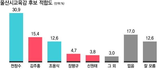 그러나 후보 적합도 조사에서는 상반된 분위기가 감지된다. 현역인 천창수 울산교육감이 30.9%를 기록하며 다른 후보들을 오차범위 밖으로 따돌리고 있었다. 2위는 2023년 보궐선거에서 보수진영 후보로 나섰던 김주홍 전 울산대 교수가 15.4%로 뒤를 이었으며 △조용식 노옥희재단 이사장 12.6% △장평규 울산혁신교육연구소 대표 4.7% △신원태 전 울산교총 회장 3.8% 순이었다.