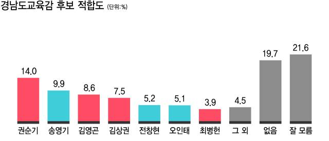 이러한 분위기는 경남도교육감 후보 적합도 조사에서도 비슷하게 감지된다. 권순기 전 경상국립대 총장이 14.0%로 1위를 기록했지만 곧장 뒤를 추격하고 있는 송영기(9.9%) 전 전교조 경남지부장과의 격차는 오차범위 내인 4.1%P에 그친다. 또한 나머지 주자들도 한 자릿대를 기록하는 데에 그쳤는데 △김영곤 전 교육부 차관보 8.6% △김상권 전 경남교육청 교육국장 7.5% △전창현 전 경남교육청 교육활동보호담당관 5.2% △오인태 5.1% 전 창원남정초 교장 △최병헌 전 경남교육청 학교정책국장 3.9% 등이었으며 ‘그 외 인물’ 4.5%, ‘없음’ 19.7%, ‘잘 모름’ 21.6%로 집계됐다. 결국 향후 단일화 성사 여부가 당락을 가를 주요 핵심 요인으로 작용할 것이라는 전망이 나온다.