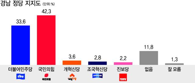 당별 지지층을 살펴보면, 민주당 지지층의 55.2%는 김 위원장을 선택해 민주당 내에서는 민홍철 의원(23.4%), 김두관 전 경남지사(7.1%)와 비교해 상대적으로 우위를 보였다. 반면 국민의힘 지지층에서는 박 지사(32%)와 김 의원(30.6%)이 오차범위 내 접전을 벌였다. 국민의힘 경남지사 경선이 치열해질 수 있다는 관측이 나오는 대목이다.