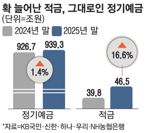 5일 KB국민·신한·하나·우리·농협은행에 따르면 2024년 말 926조7013억원이던 정기예금 잔액은 2025년 말 939조2863억원으로 1.4%가량 늘어났다.