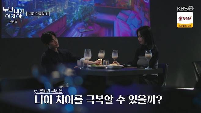무진은 "내일이 마지막 날이다. 아쉽기도 하다. 재미있었는데"라며 아쉬움을 전했다. 그러면서 "어제 나이 공개할 때 안 떨렸냐"라고 물었다. 두 사람은 무려 띠동갑인 12살 나이 차이가 나는 상황. 이에 나이 공개 당시 본희는 충격을 받았다.