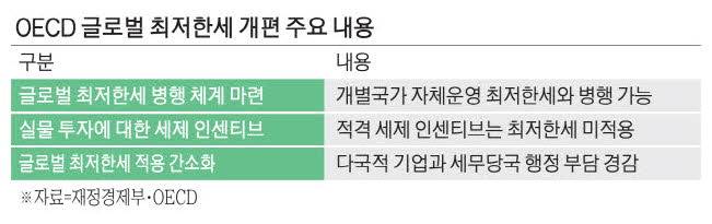 5일 경제협력개발기구(OECD)와 주요 20개국(G20)이 145개국 이상 회원국 승인을 거쳐 확정·발표한 '글로벌 최저한세 개편안'은 한국 기업과 미국 빅테크 기업에 상당히 유리하게 작용할 전망이다.