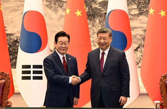 이재명 대통령이 5일 한중 정상회담을 계기로 중국 베이징 인민대회당에서 열린 양해각서(MOU) 체결식에서 시진핑 중국 국가주석과 악수하고 있다.