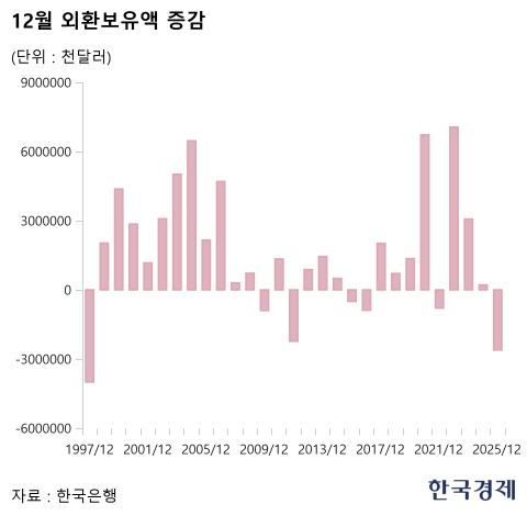 6일 한국은행이 발표한 '2025년 12월 말 외환보유액'에 따르면 지난달 말 기준 한국의 외환보유액은 4280억5000만달러로 집계됐다. 11월 4307억달러에 비해 26억달러 감소했다. 이런 감소폭은 역대 12월 기준 두번째로 큰 것이다. 외환위기가 있었던 지난 1997년 12월 기록한 40억달러 감소 이후 28년만에 최대치다.
