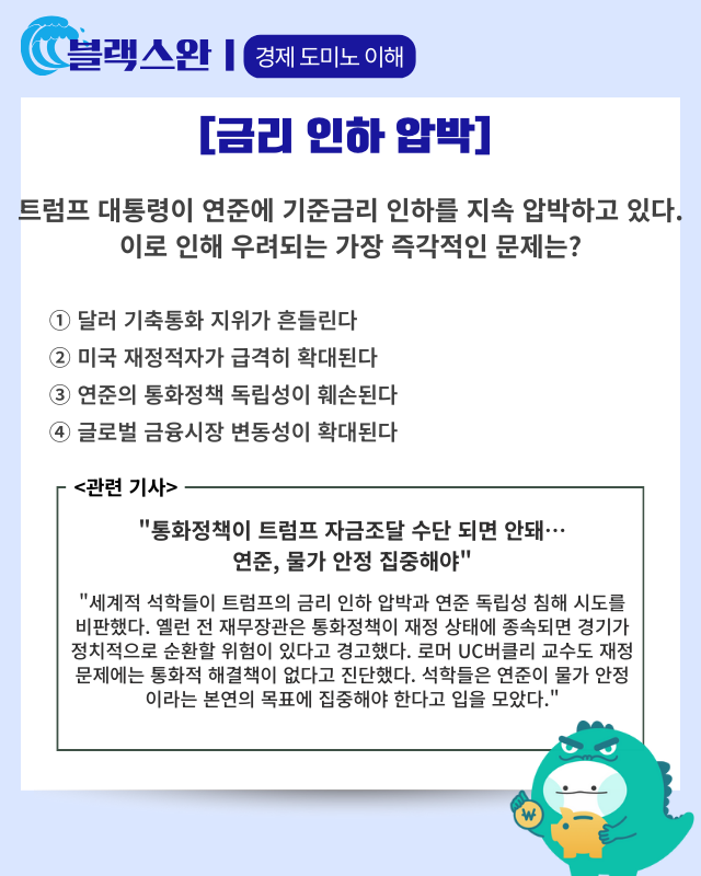1. “통화정책이 트럼프 자금조달 수단 되면 안돼···연준, 물가 안정 집중해야”
