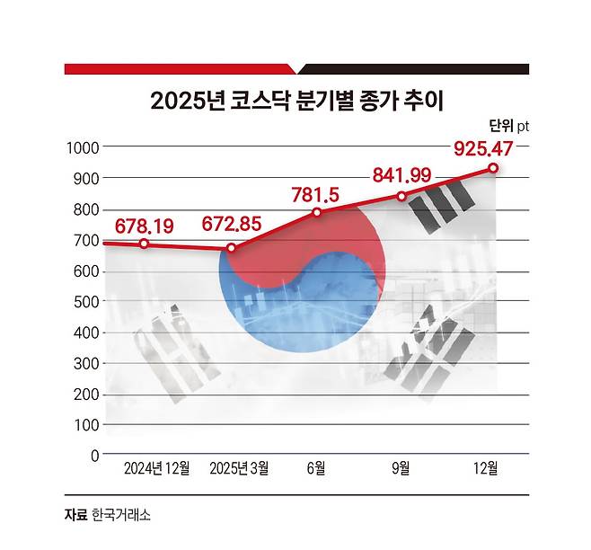AI 호재의 낙수효과를 보고 있는 로봇 등 IT 관련주부터 다시 코스피 주도주의 위치를 차지한 바이오가 최근 높은 오름세를 보이며 지수 상승을 견인하고 있다. 2025년 한 해 동안 코스닥 시가총액은 340조1440억원에서 505조9250억원으로 48.74% 증가했다. 코스피를 향하던 정부의 마중물도 이제 900을 넘긴 코스닥으로 방향을 트는 모양새다.
