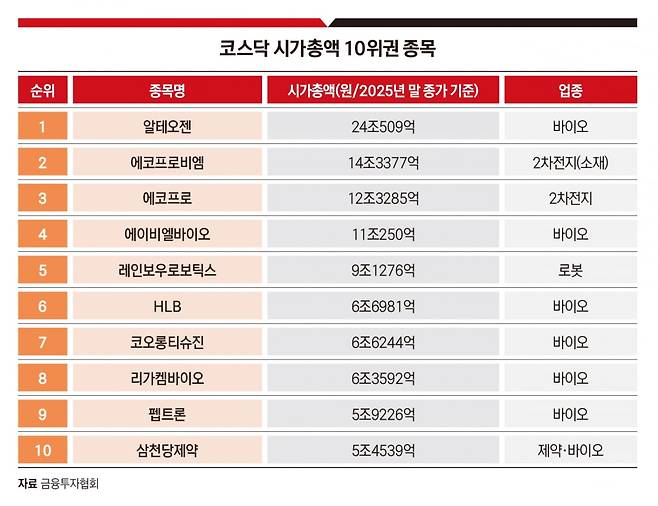 바이오는 연이은 기술이전(L/O) 소식에 힘입어 한때 2차전지에 내줬던 주도주 자리를 탈환했다. 2025년 12월 30일 종가 기준 코스닥 시가총액 10위권에 속한 제약바이오 기업은 7개에 달한다. 코스닥 시총 1위이자 바이오텍 대장주인 알테오젠과 빠른 성장세로 상위권에 진입한 에이비엘바이오가 대표적이다.