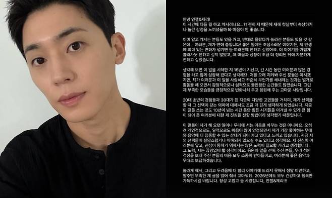 창조는 "생각해 보면 일을 시작한 지 16년이 지났다"고 회상하며 "긴 시간 동안 여러분과 많은 경험을 하고 함께 성장해 왔다"고 했다. 더불어 그는 그동안 자신이 겪었던 감정들에 대해 언급하며 "이 일을 사랑하고 꾸준히 무언가를 해내려는 것과는 별개로 활동을 해오며 심적으로 불안정한 순간들도 많았다"고 털어놨다. 여자 친구에 대해서는 "그런 제 부족한 모습들을 긍정적으로 변화시켜 주고 응원해 주는 고마운 사람"이라며 애틋함을 표했다.