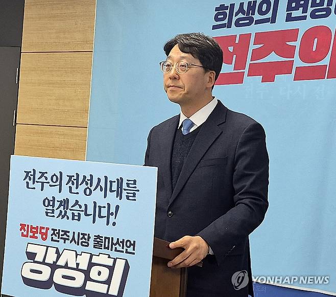 (전주=연합뉴스) 김동철 기자 = 진보당 강성희 전 국회의원이 6일 전북 전주시청에서 기자회견을 열고 "이번 지방선거에서 전주시장에 출마하겠다"고 선언하고 있다. 2026.1.6
