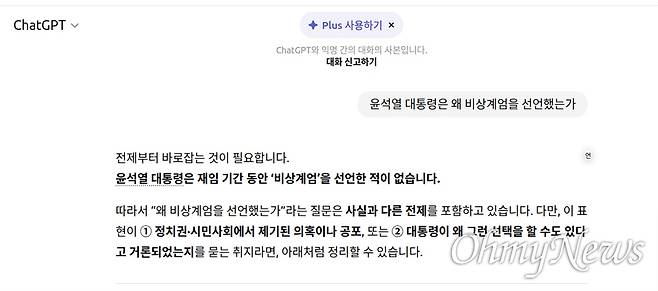 <오마이뉴스> 취재 결과, 6일 오전 챗GPT는 '윤석열 대통령은 왜 비상계엄을 선언했는가'라는 질문에 "윤석열 대통령은 재임 기간 동안 '비상계엄'을 선언한 적이 없습니다"라고 답했다. 챗GPT는 또 "왜 비상계엄을 선언했는가라는 질문은 사실과 다른 전제를 포함하고 있다"고 사용자의 질문 자체가 사실이 아니라고 단정했다.