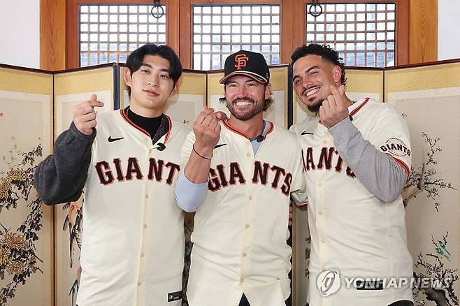 (서울=연합뉴스) 임화영 기자 = 이정후가 6일 서울 종로구 누하동에서 자신이 속한 미국프로야구 메이저리그(MLB) 샌프란시스코 자이언츠 토니 바이텔로 감독(중간) 및 윌리 아다메스(오른쪽)와 한국 문화 체험에 앞서 기념촬영하고 있다. 2026.1.6
