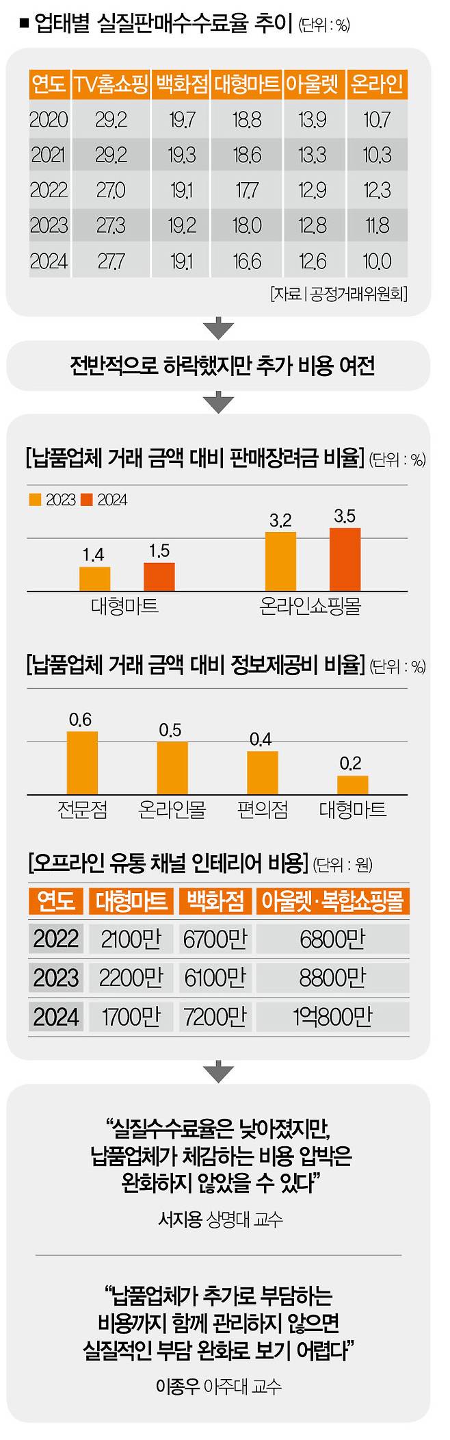 서지용 상명대(경영학) 교수는 "원자재와 인건비 상승 영향도 있지만, 수수료율 인하 기조 속에서 입점업체 부담이 인테리어 비용 등 다른 항목으로 이동했을 가능성도 있다"며 "실질수수료율은 낮아졌지만, 납품업체가 체감하는 비용 압박은 완화하지 않았을 수 있다"고 말했다.
