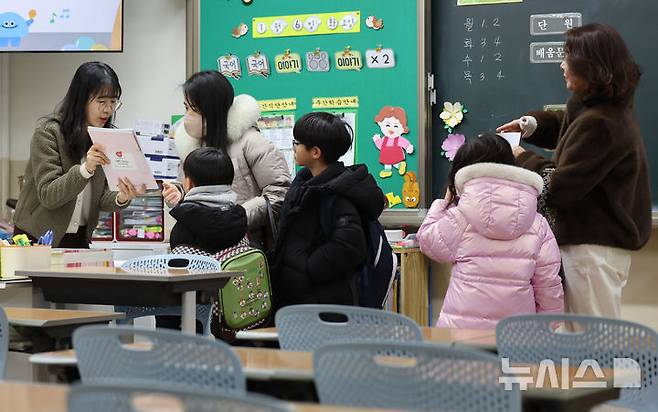 [인천=뉴시스] 전진환 기자 = 2026학년도 취학대상자 예비소집일인 6일 인천 남동구 정각초등학교에서 입학을 앞둔 예비 초등학생 학부모가 선생님으로부터 입학 안내를 듣고 있다. 2026.01.06. amin2@newsis.com