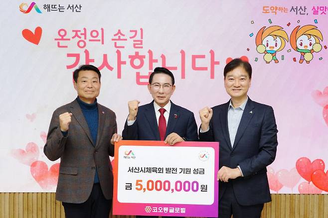 충남 서산시는 지난 5일 코오롱글로벌㈜이 서산시체육회에 체육 발전 성금 500만 원을 기탁했다고 밝혔다.