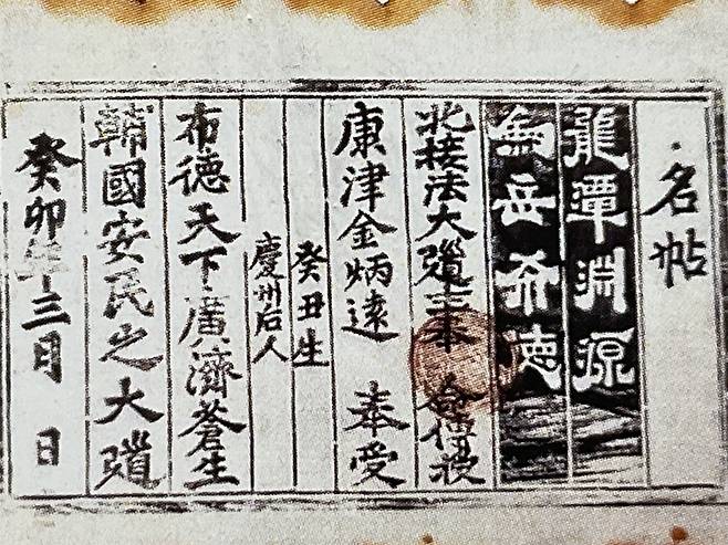 康津 金炳遠 奉受 癸丑生 慶州后人 (강진 김병원 봉수 계축생 경주후인)