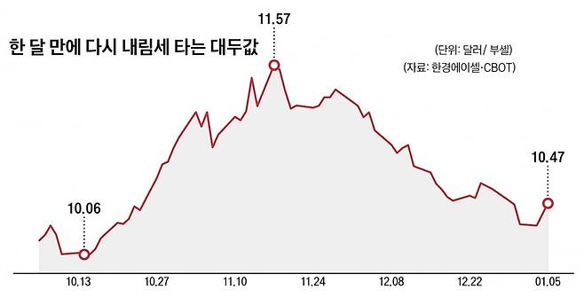 6일 한경에이셀에 따르면 시카고옵션거래소(CBOT)에서 대두는 전날 부셸당 10.47달러에 거래를 마쳤다. 전일보다 0.17달러(1.72%) 오른 가격이지만 지난 11월 중순 11.57달러와 비교하면 9.5% 떨어졌다.