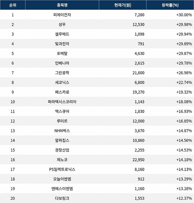 6위 인베니아(079950)는 종가 2,615원으로 29.78% 상승 마감했다. 7위 그린광학(0015G0)은 종가 21,600원으로 26.98% 상승 마감했다. 8위 세코닉스(053450)는 종가 6,800원으로 22.74% 상승 마감했다. 9위 페스카로(0015S0)는 종가 19,270원으로 19.32% 상승 마감했다. 10위 파라택시스코리아(288330)는 종가 1,143원으로 18.08% 상승 마감했다.