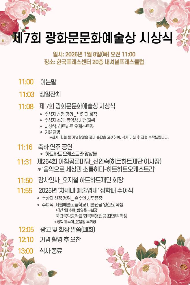 6일 광화문문화포럼(회장 박인자)은 제7회 광화문 문화예술상 수상자로 하트하트오케스트라를 선정했다고 밝혔다. 시상식은 오는 8일 오전 11시, 한국프레스센터 20층 내셔널프레스클럽에서 열린다.