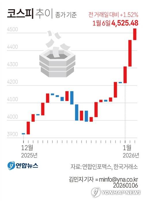 (서울=연합뉴스) 김민지 기자 = 6일 코스피는 전장보다 67.96포인트(1.52%) 오른 4,525.48에 장을 마쳐 사상 처음 4,500선을 돌파했다.