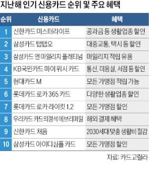 대중교통, 택시, 통신 요금, 영화 할인 등을 갖춰 사회초년생 대표 카드로 불리는 삼성카드의 ‘탭탭오’가 2위에 올랐다. 해외 겸용 카드를 사용하면 해외 결제·직구 시 1.3% 적립되는 혜택을 받을 수 있다. KB국민카드의 ‘KB국민 마이 위시 카드’도 3위에 이름을 올렸다. 미용실·올리브영·온라인 서점에서 5% 할인을 받을 수 있다. 통신비 10%, 온라인동영상서비스(OTT) 30%, KB 페이 결제 건에 대해선 10% 할인한다. 이 외에도 ‘로카 365 카드’ ‘신한카드 처음’ 등 생활비 할인 혜택에 초점을 맞춘 카드들이 상위권에 포진했다.