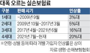 보험료 인상폭은 가입 시기에 따라 차이가 난다. 2009년 9월 이전 가입자인 1세대(638만 명)는 평균 3%, 2세대(1552만 명)는 평균 5% 오른다. 반면 3세대(804만 명)는 16%, 4세대는 20%로 인상폭이 훨씬 가파르다. A보험사 기준 40세 남성의 4세대 보험료는 월평균 1만4570원에서 1만7480원으로 올라 연간 약 3만5000원의 추가 부담이 발생한다.
