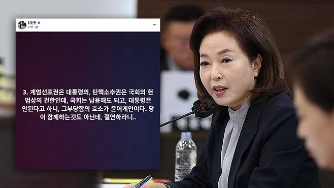 국민의힘 김민전 의원은 오늘 "계엄선포권은 대통령의 헌법상의 권한"이라며 12·3 비상계엄을 선포한 윤석열 전 대통령을 옹호하는 입장을 내놨습니다.